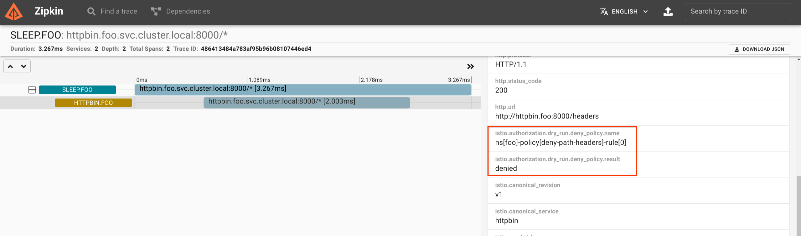 deny-path-headersin the namespacefoo:istio.authorization.dry_run.deny_policy.name: ns[foo]-policy[deny-path-headers]-rule[0] istio.authorization.dry_run.deny_policy.result: deniedThe following is a screenshot of the Zipkin dashboard: